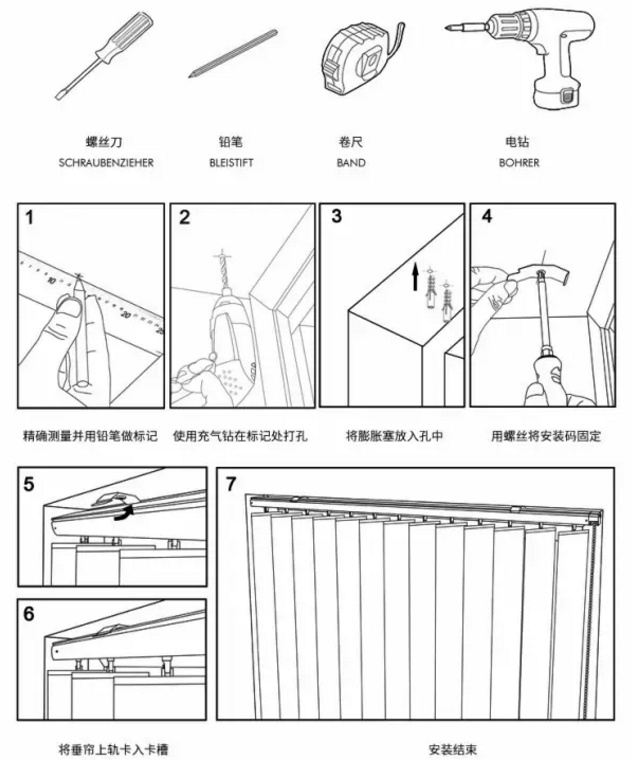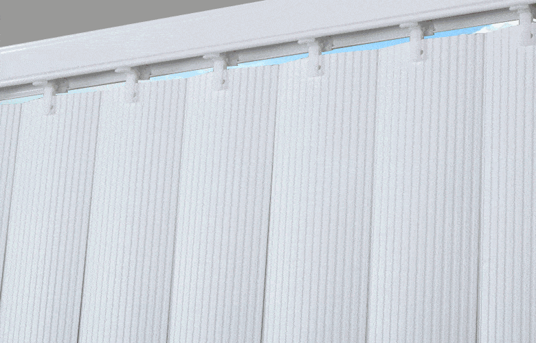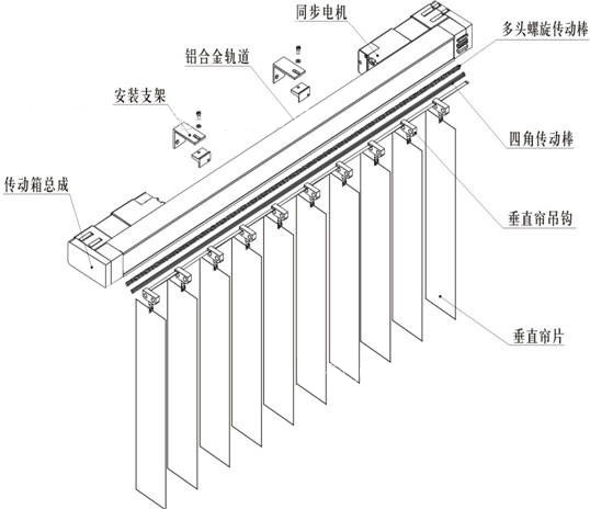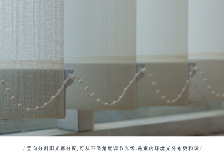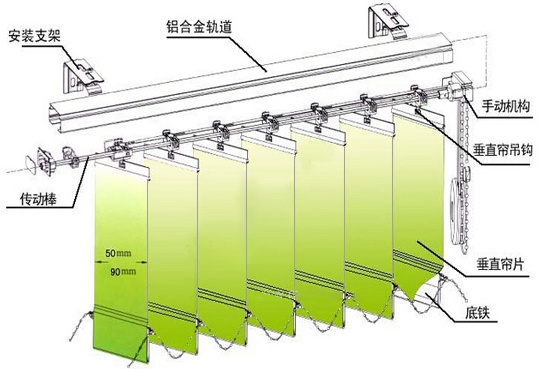 垂直帘由帘片、轨道、滑箱组、下摆珠链四部分组成。
