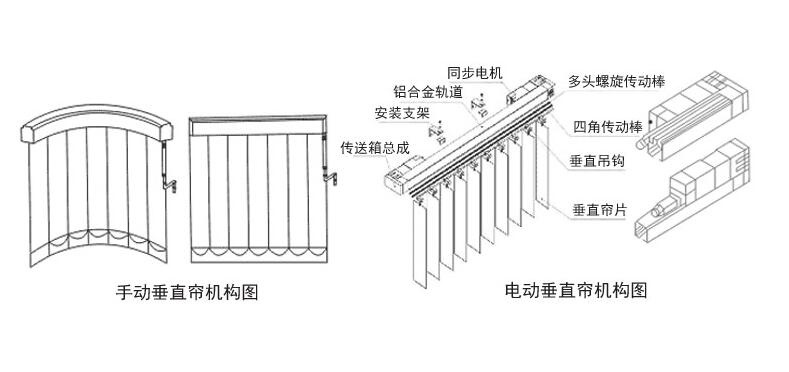 根据操作方式不同分为:手动垂直帘、电动垂直帘。根据轨道的不同可分为:直路垂直帘、弯路轨垂直帘。根据帘片的不同可以分为:PVC垂直帘、普通面料垂直帘、铝合金垂直帘。