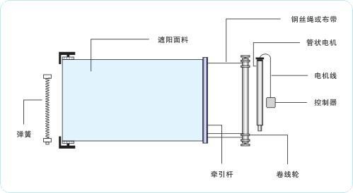 1.系统使用一台管状电机和一套弹簧系统,电机提供动力,弹簧系统提供回卷张力;