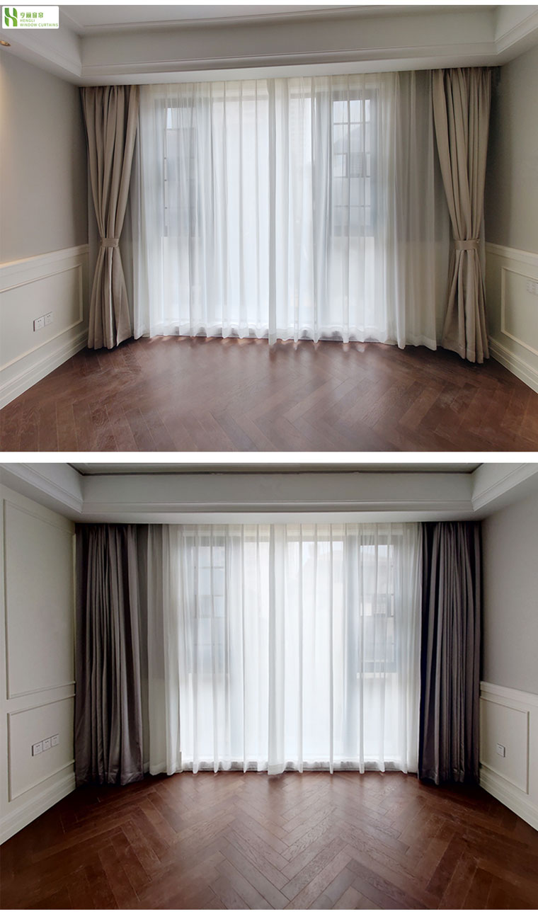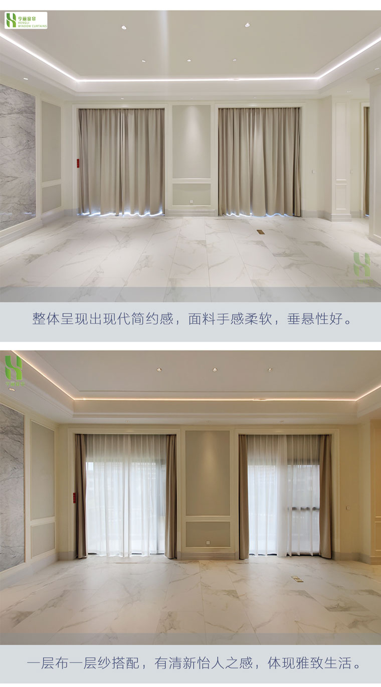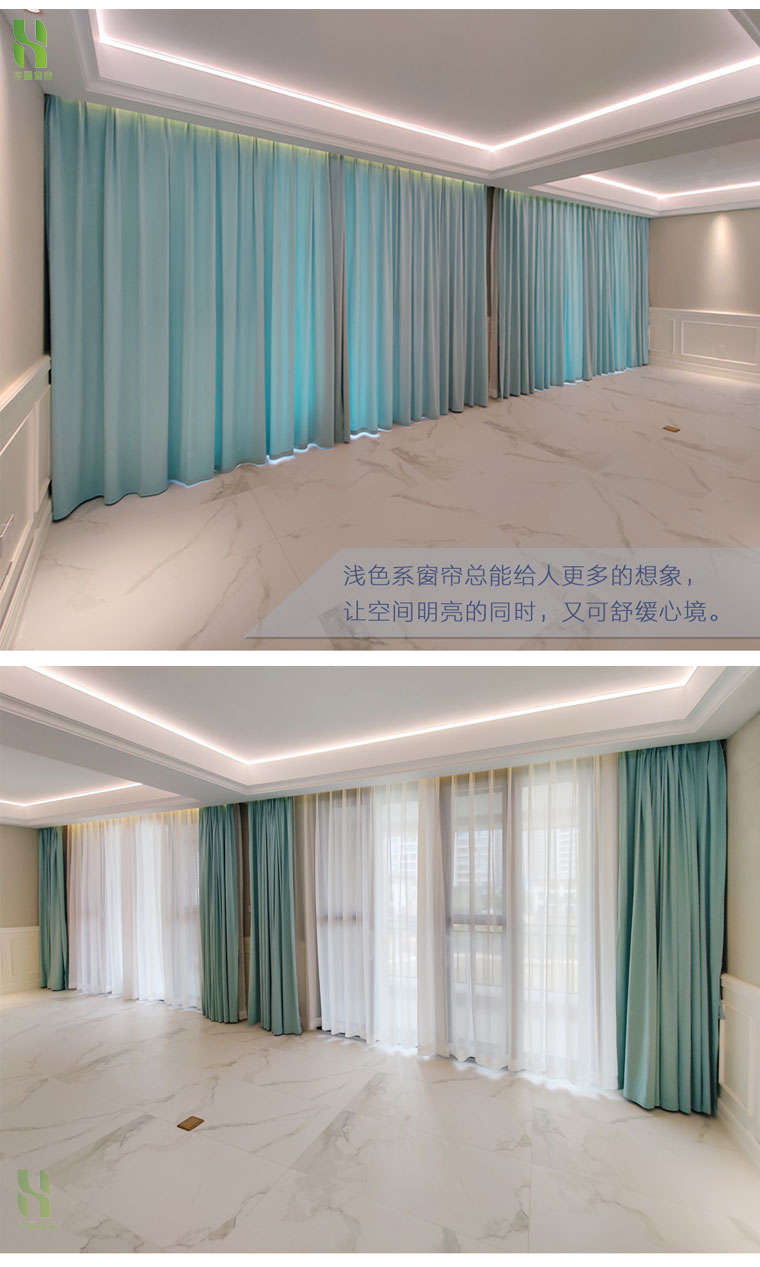 Quantity: 800 meters of fabric curtains and gauze curtains; Wooden blinds and honeycomb curtains covering an area of 200 square meters.