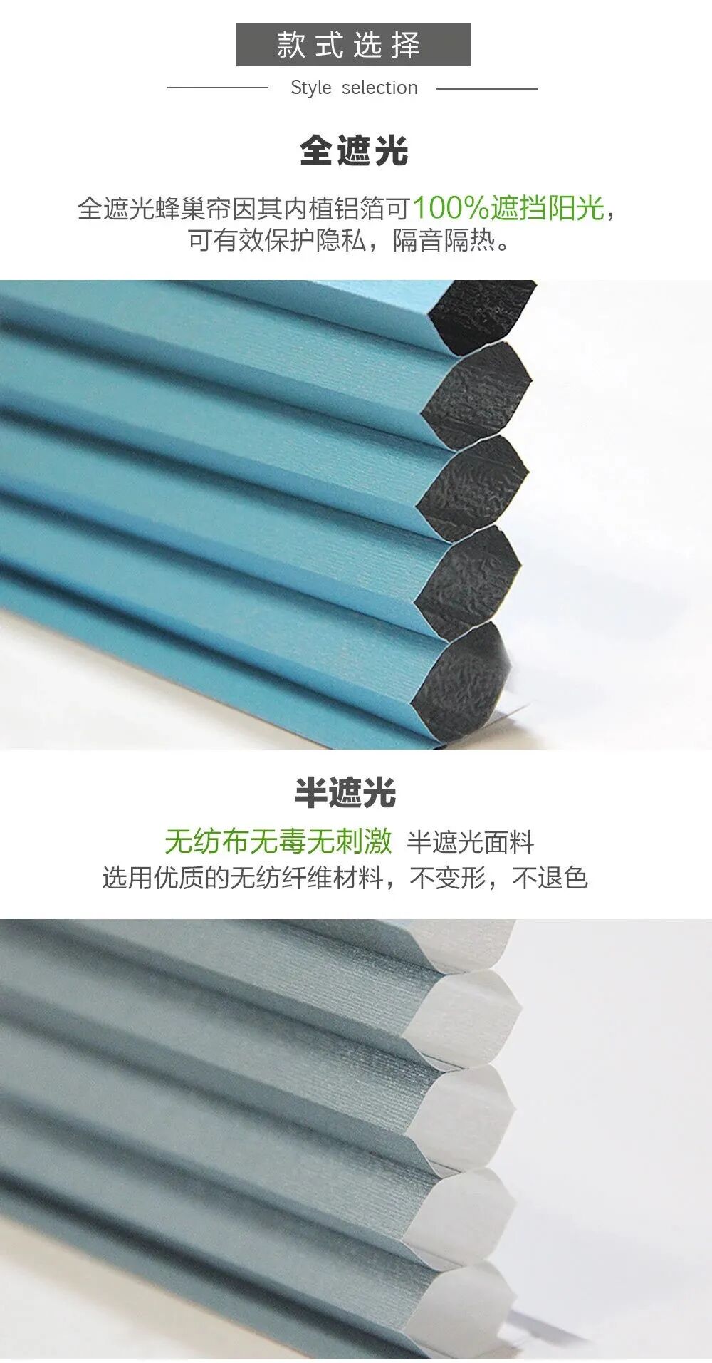 The folds of the honeycomb curtain when it is pulled down from top to bottom are like ripples on the surface of water blown by a breeze. The product has a three-dimensional feel and elegant lines with dynamic beauty. The product is sound-proof, heat-proof and moisture-retaining, which helps to keep the room at a constant temperature, let Indoor have the feeling of warm in winter and cool in summer. Widely used in: Home, school, Hotel, Villa, office, office building, entertainment and so on.