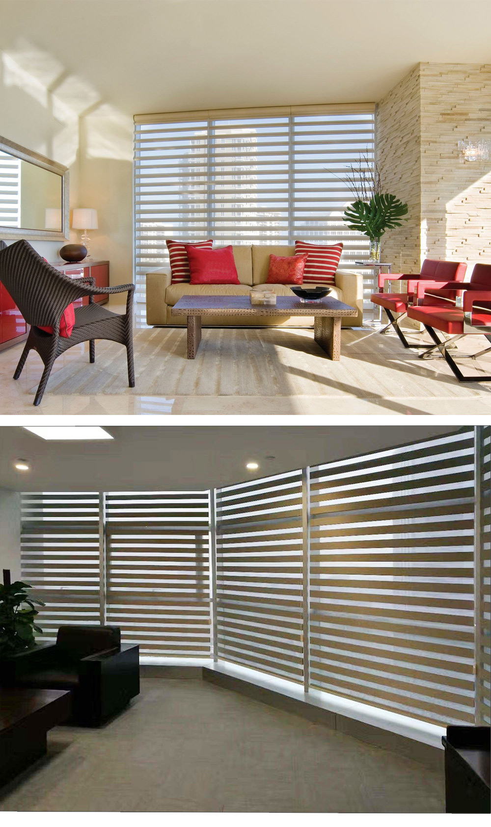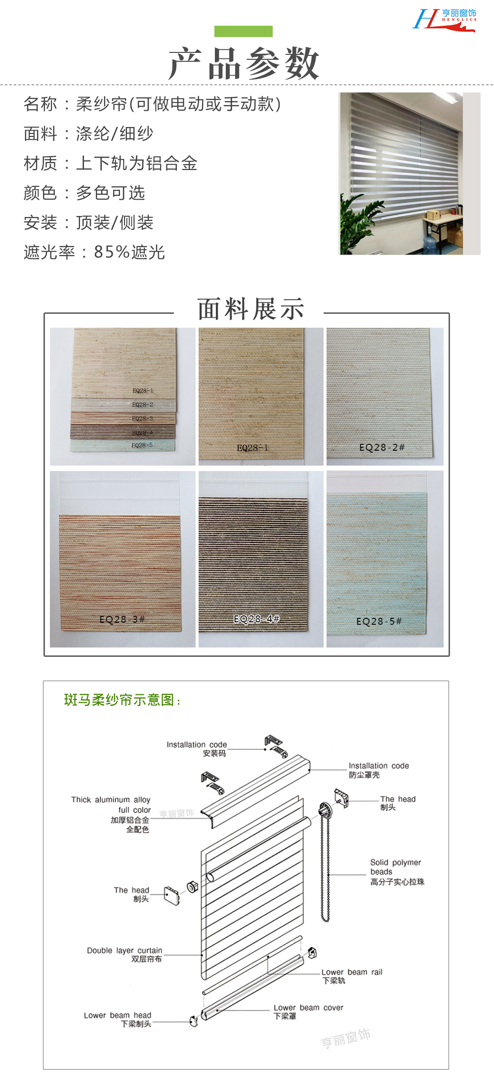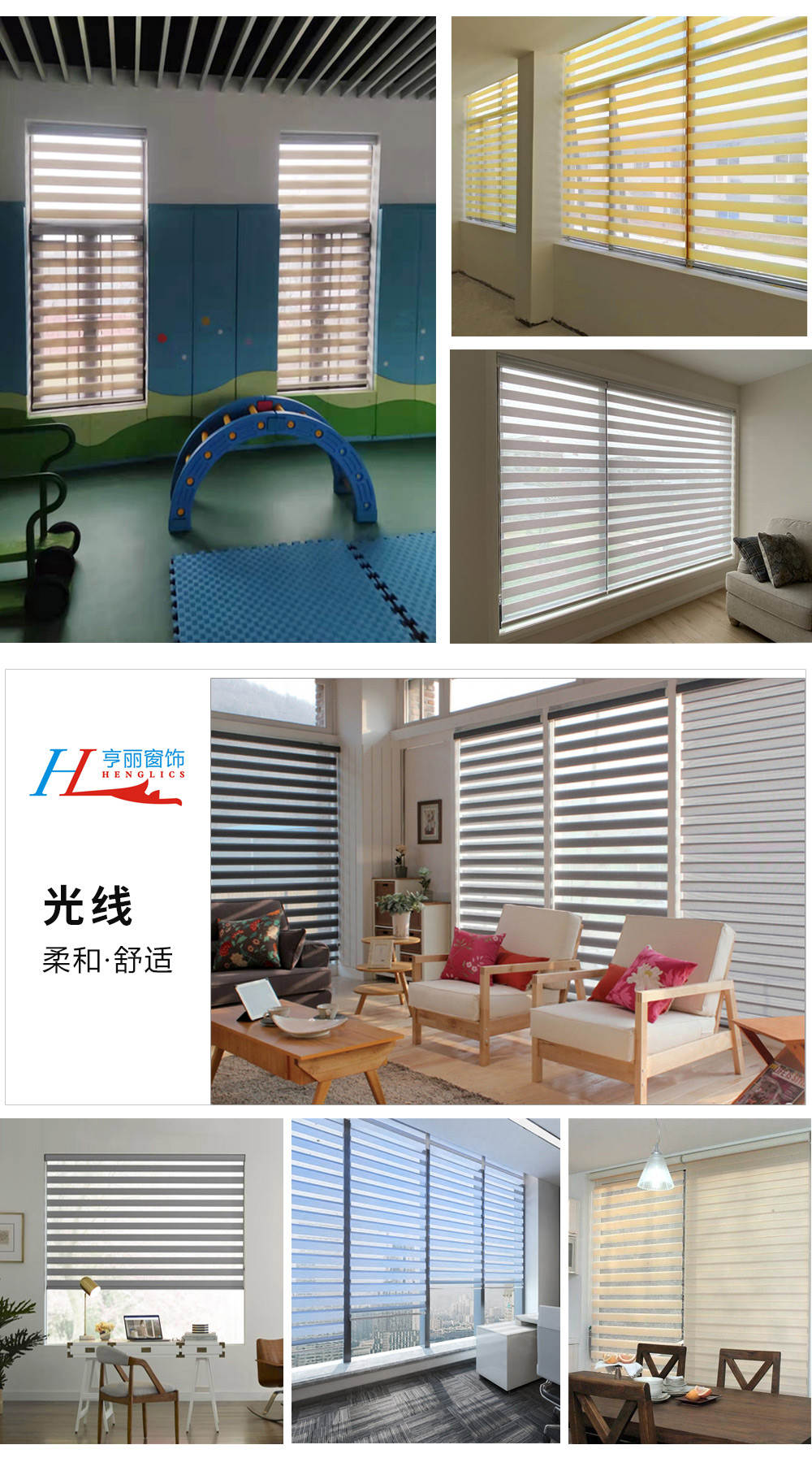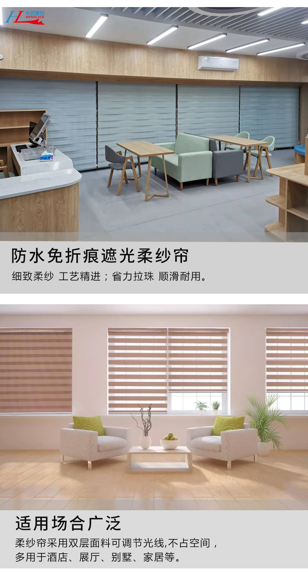 Soft gauze curtains, also known as dimmable curtains, double-layer roller blinds, day and night curtains, rainbow curtains, Roulisi curtains, etc., originated in Korea. Its materials are mainly polyester, linen, and nylon, and it uses double-layer fabric to adjust the light without taking up space; Suitable for high-end office spaces such as homes, hotels, villas, etc.