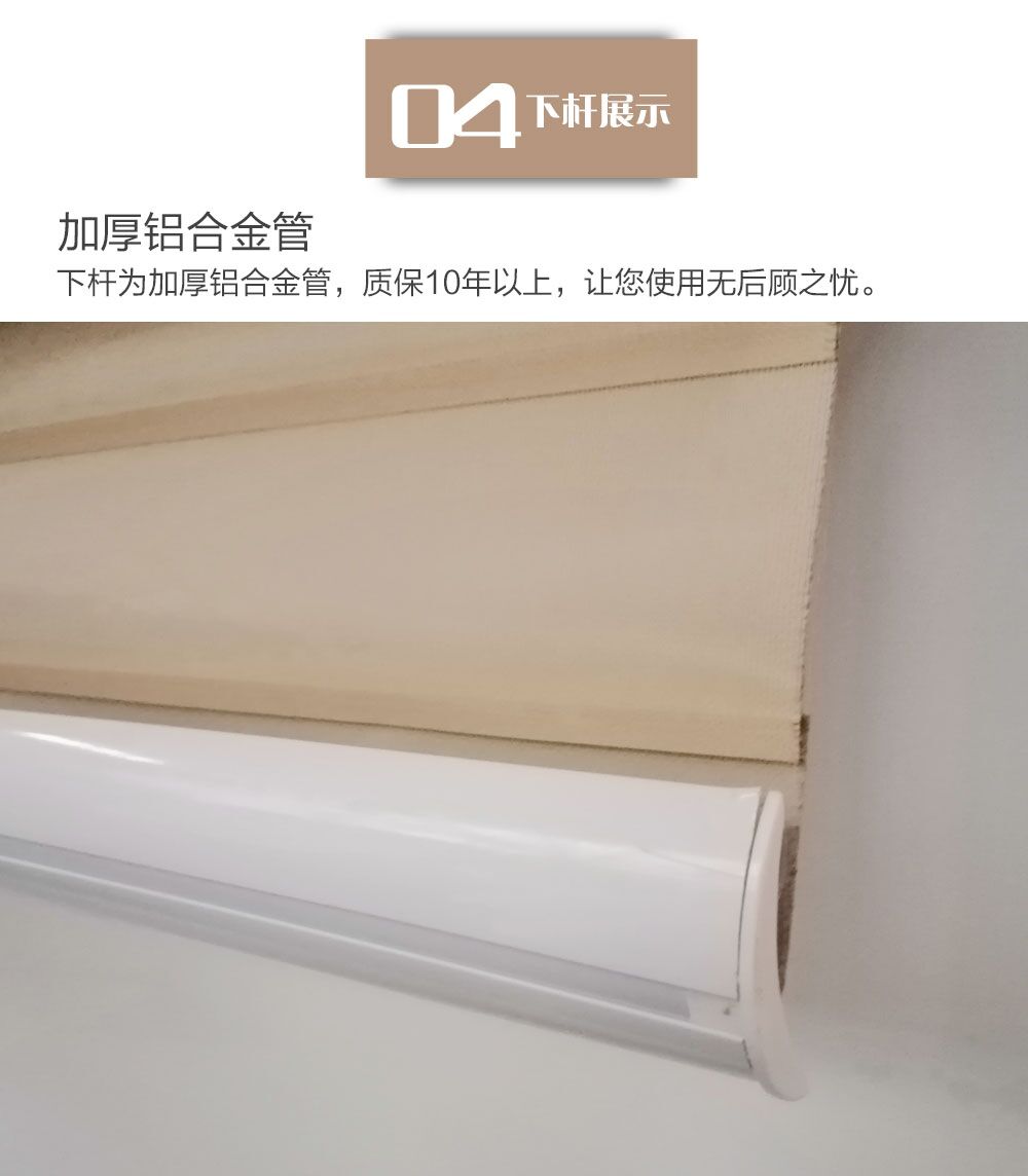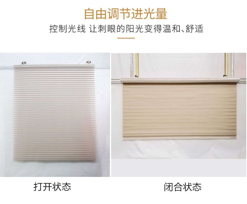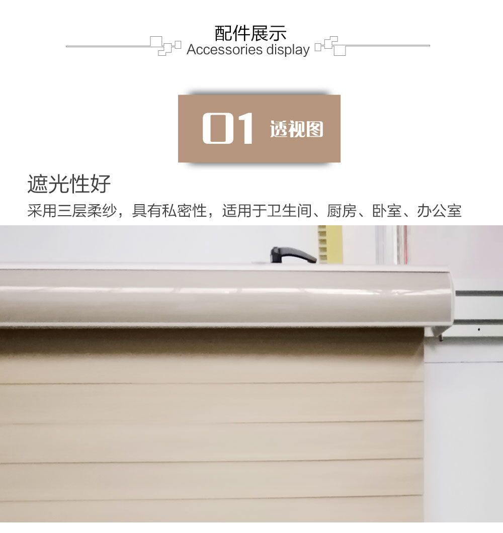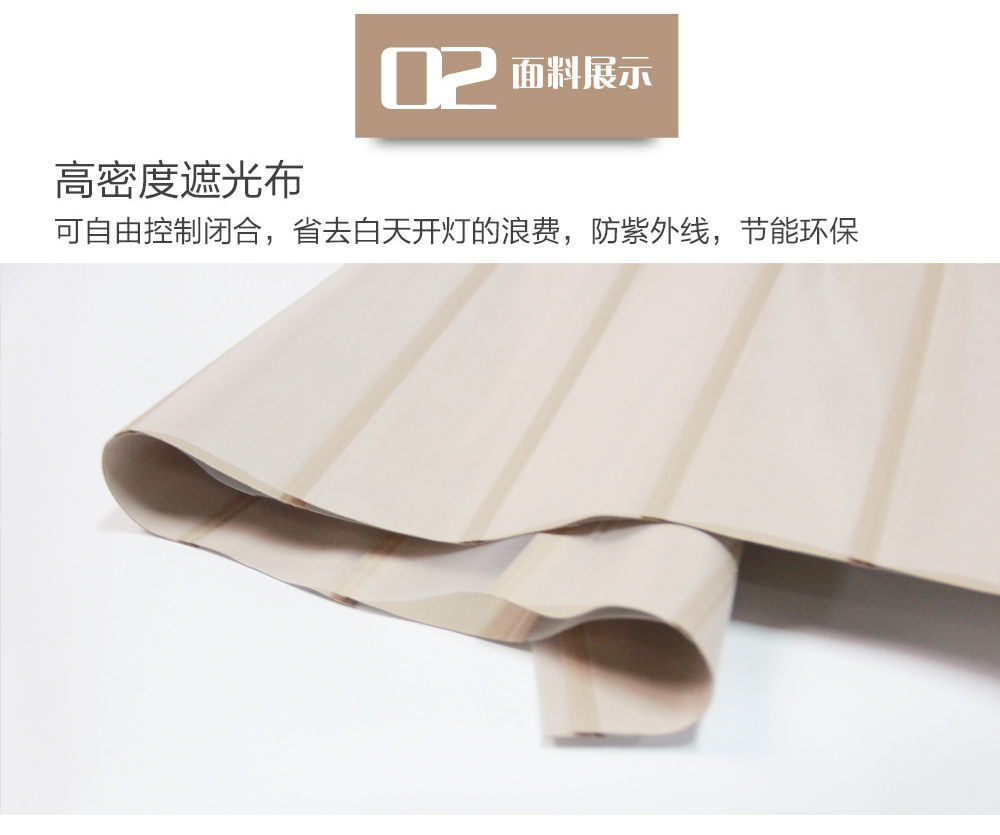 3、面料:全部打开时,两层薄纱相互垂直平行,这时通过一侧纱的高低时,光线会减少射入,两层薄纱紧贴时,光线全部遮住,继续调整窗帘的高度,窗帘则会沿上轴卷起,从而起到良好的控光效果。