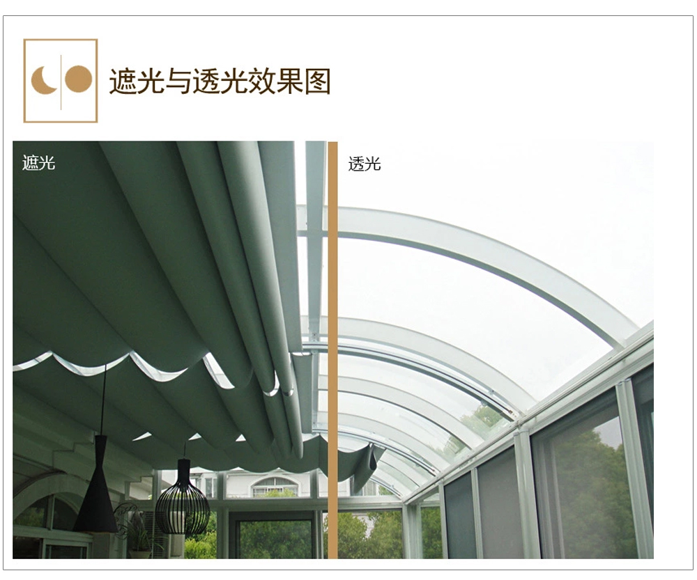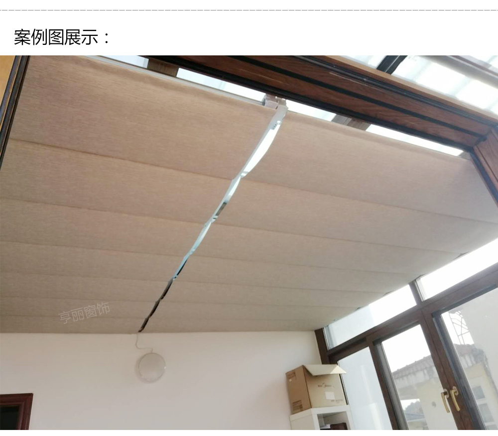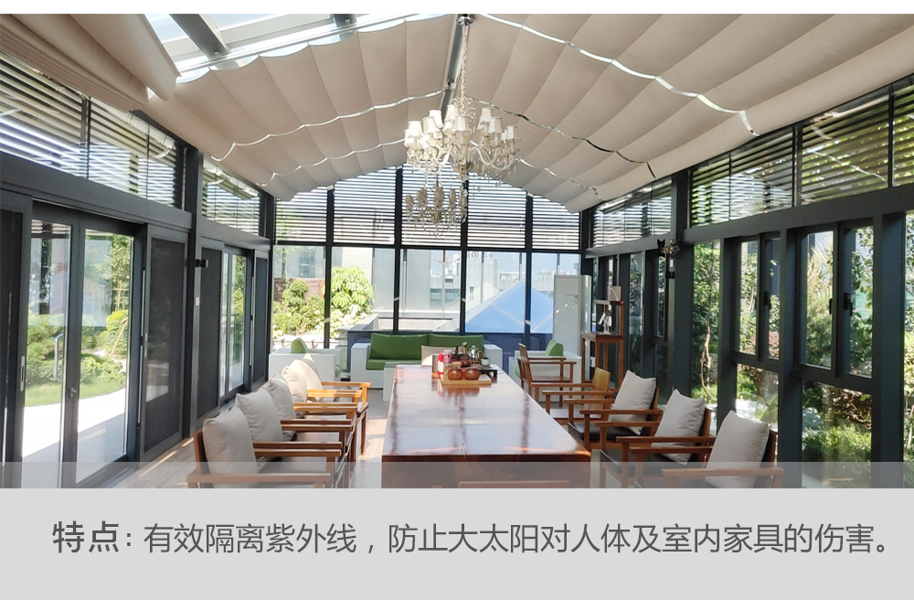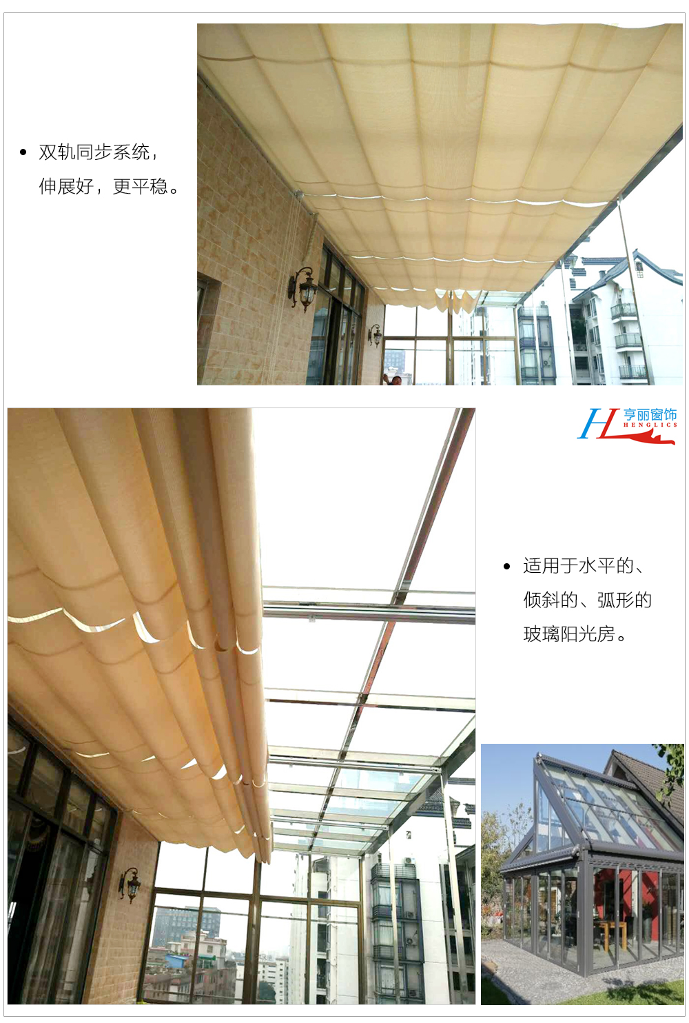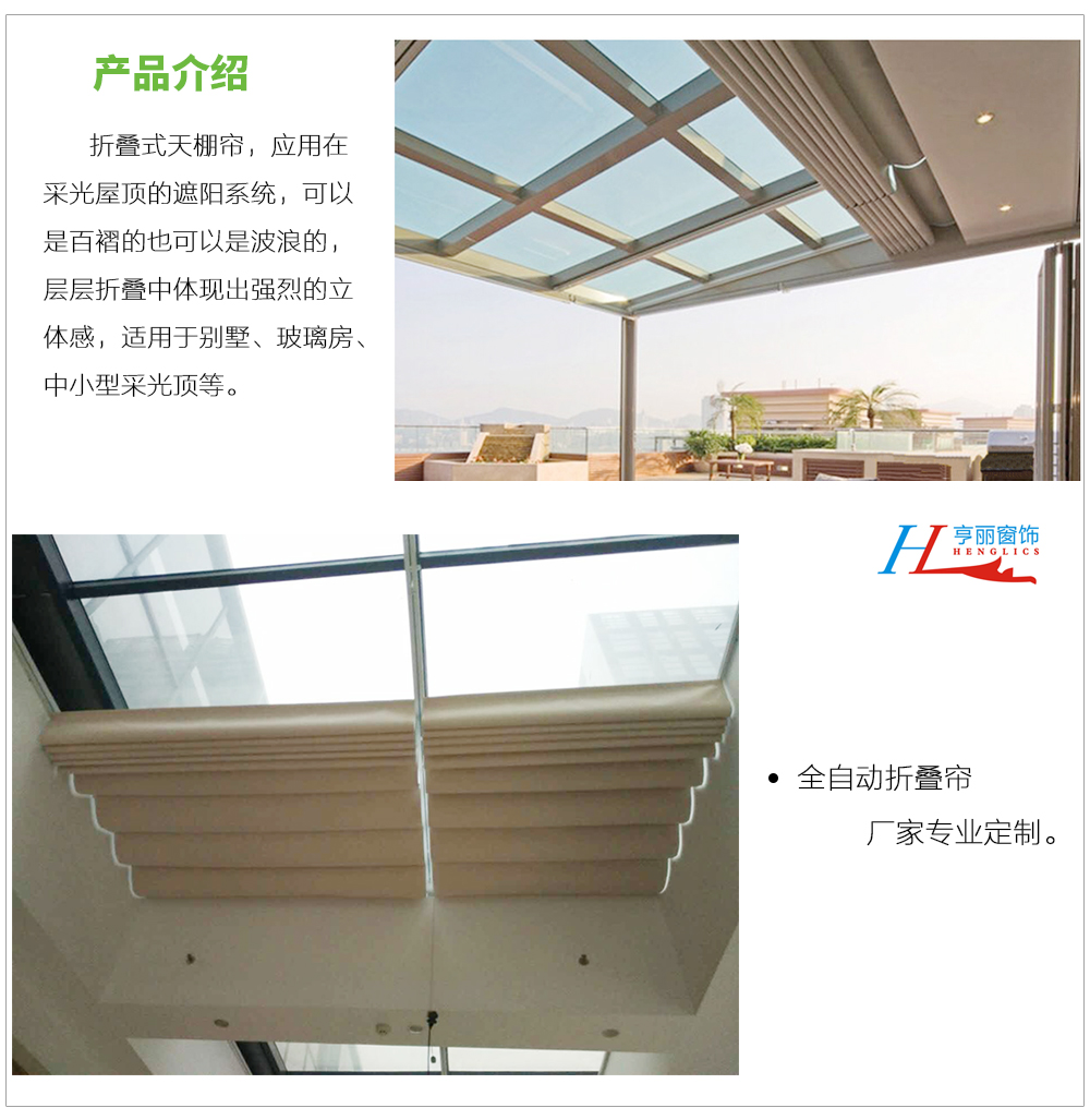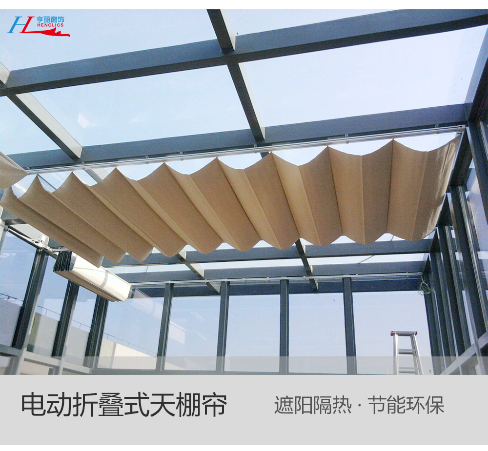如波浪般的布料整齐地伸展在采光屋顶下,层层折叠中体现出强烈的立体感,亨丽电动折叠式天棚帘系统中,布料固定在等距分布的横向连接杆上,对面料要求不高,因此给客户更多选择。适用于别墅、玻璃房、中小型采光顶等。