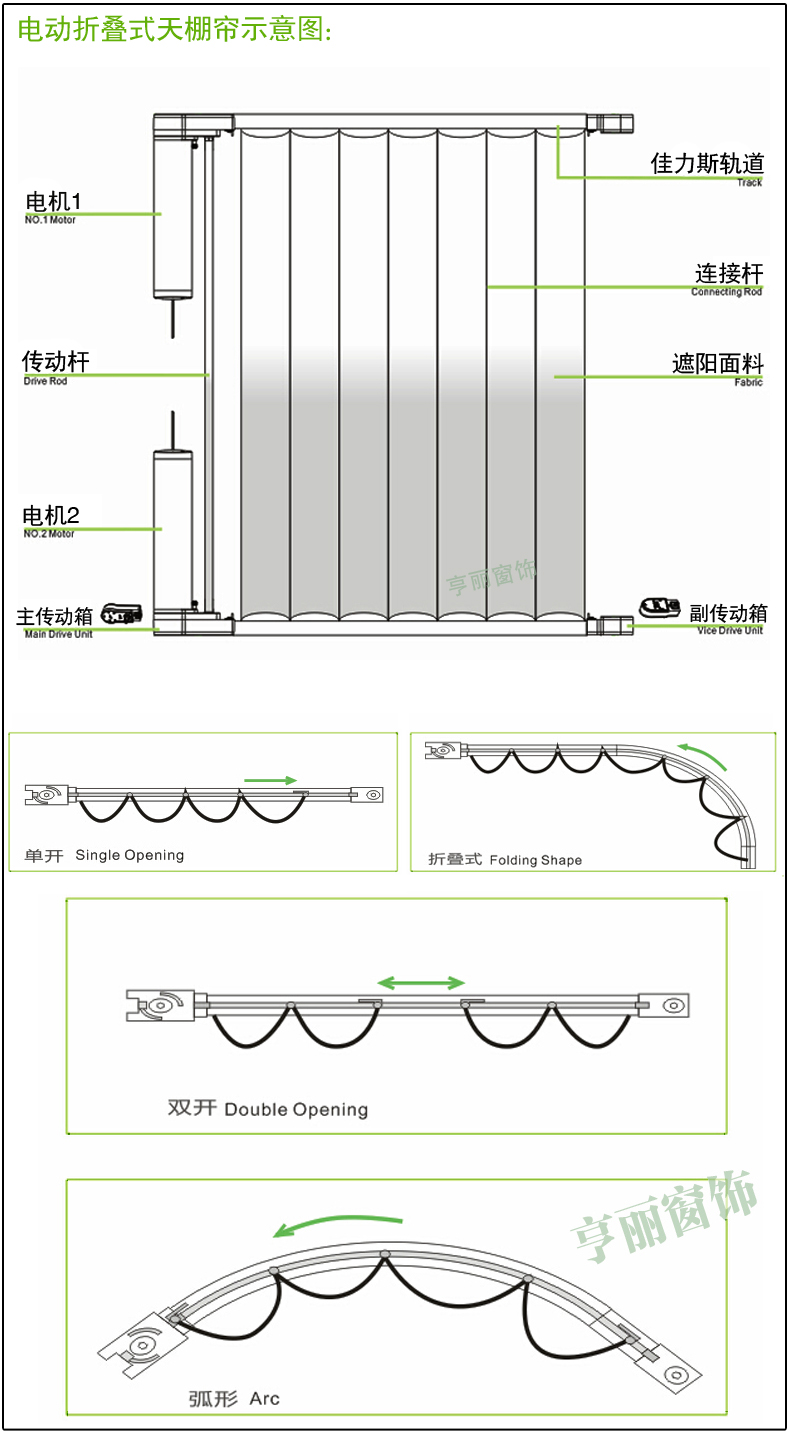 2、单开或双开方式,根据不同规格采用2台或4台电机,单幅最大长度10米,最大幅宽2米,最大应用面积16平方米,天棚帘完全展开后,布料呈现均匀波浪效果。