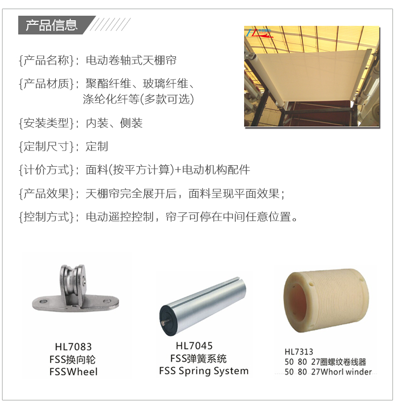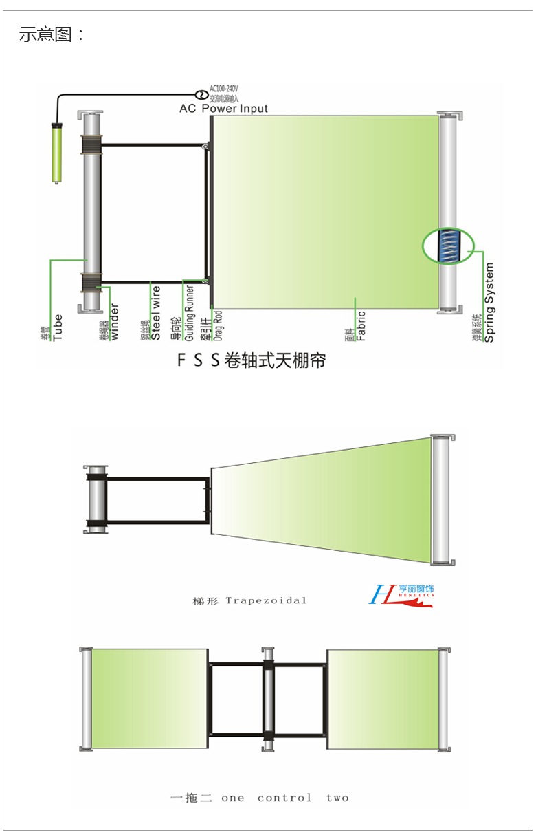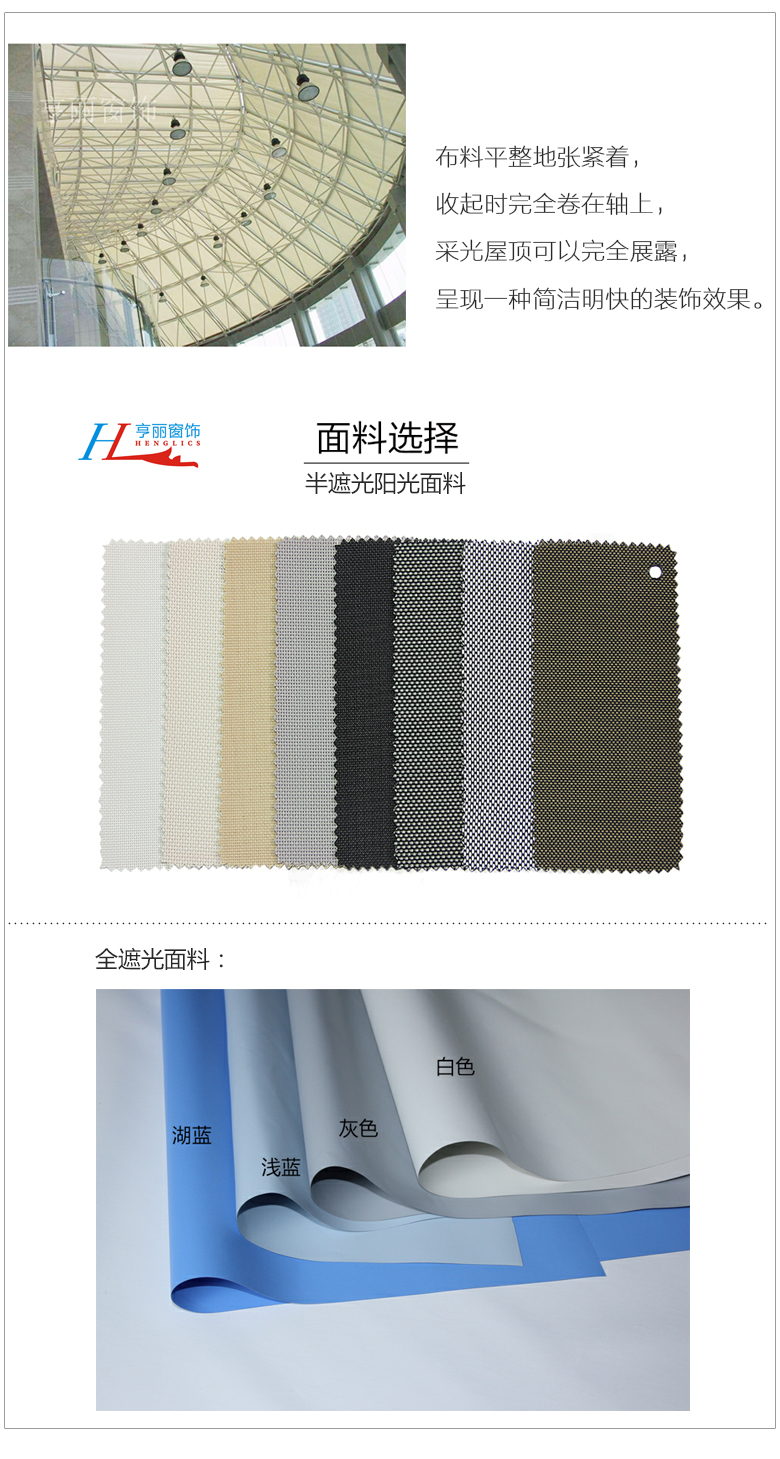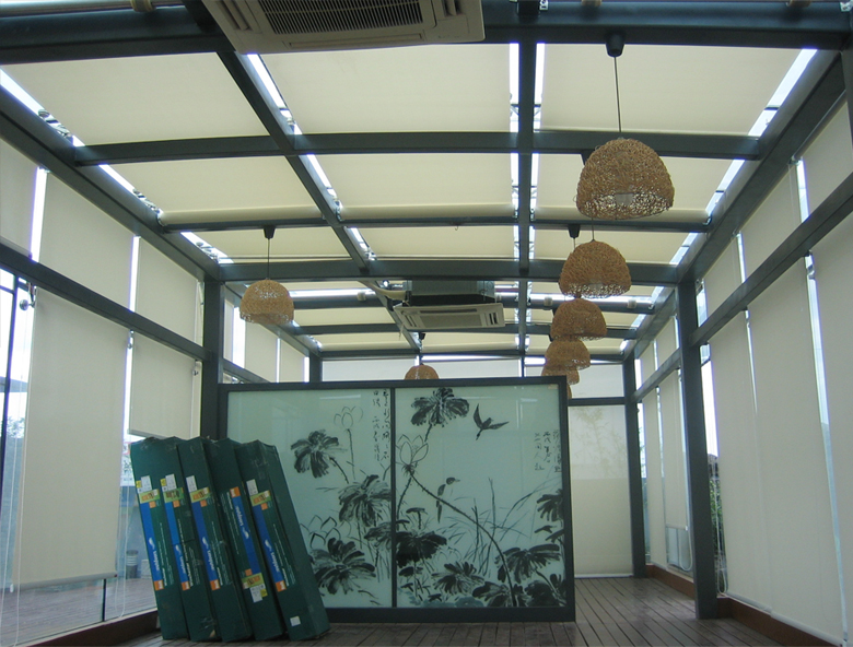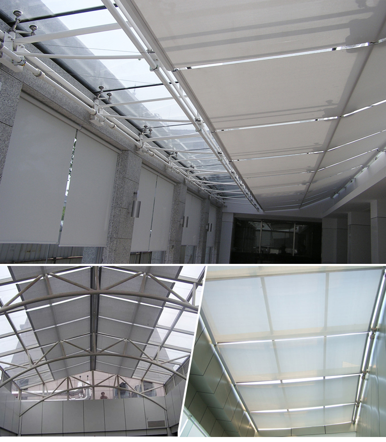 布料平整地张紧着,收起时完全卷在轴上,采光屋顶可以完全展露,呈现一种简洁明快的装饰效果。FSS天棚帘对建筑结构的影响很小,是办公、酒店、学校、医院以及各种商业建筑的理想选择。