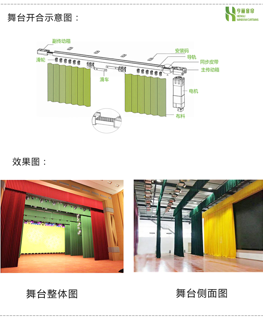 1、电动舞台开合幕选用同步电机,电机体积小、拉力大,可拉动超重型大幕。