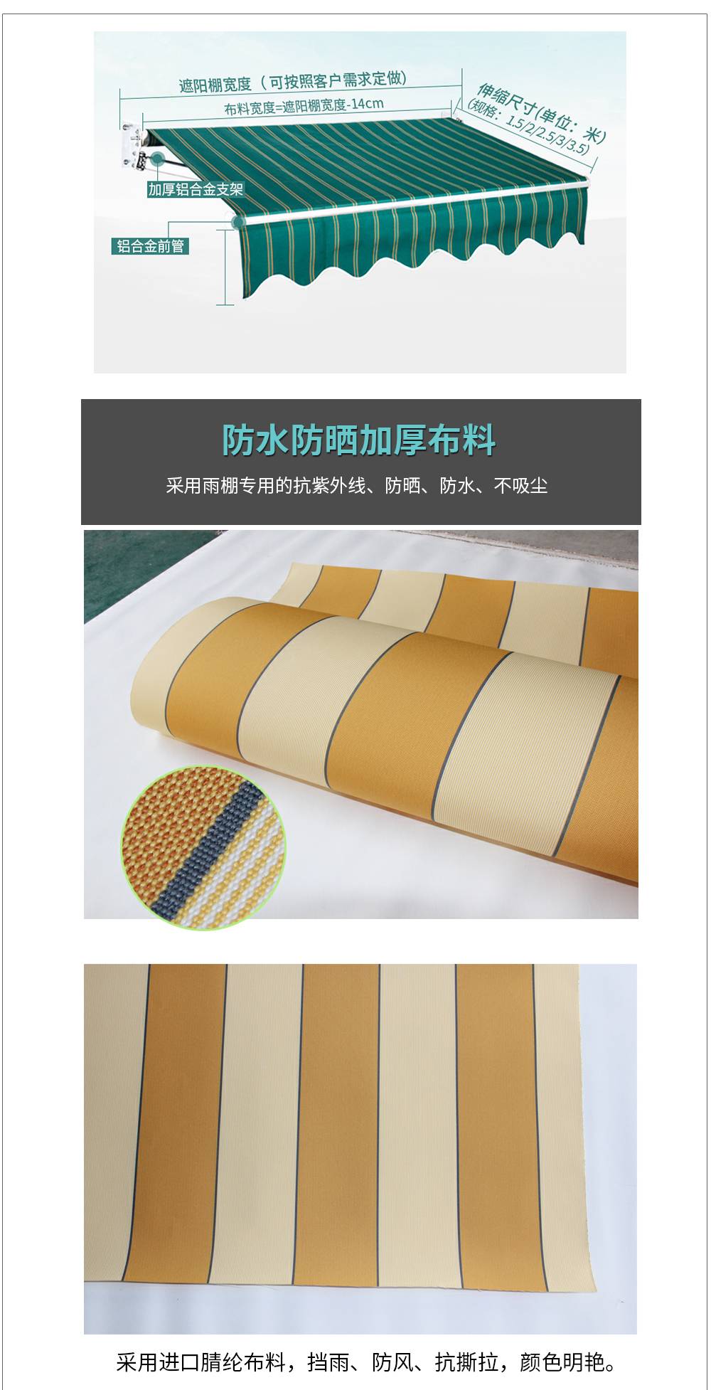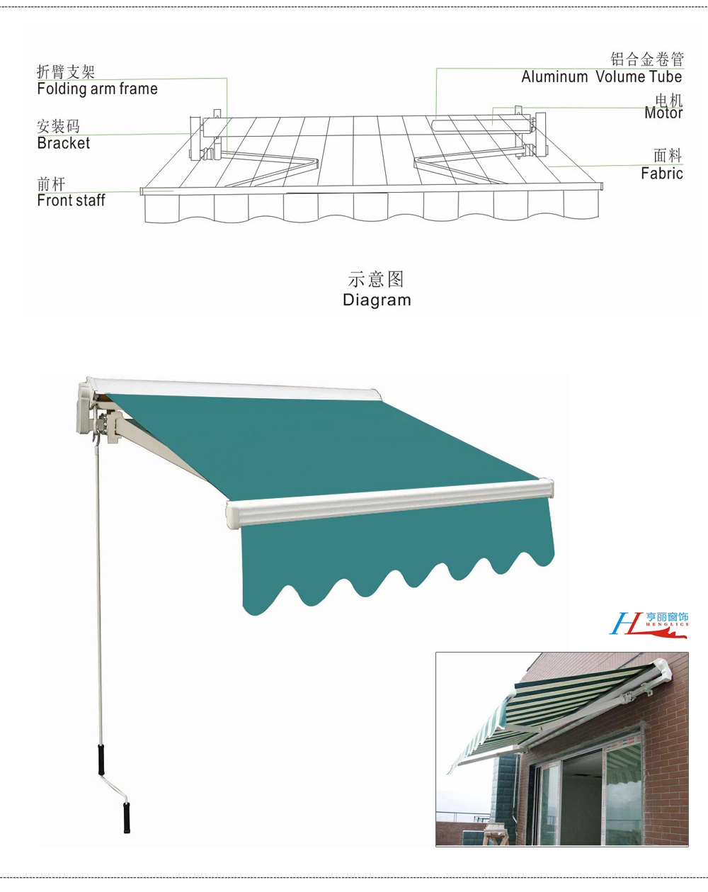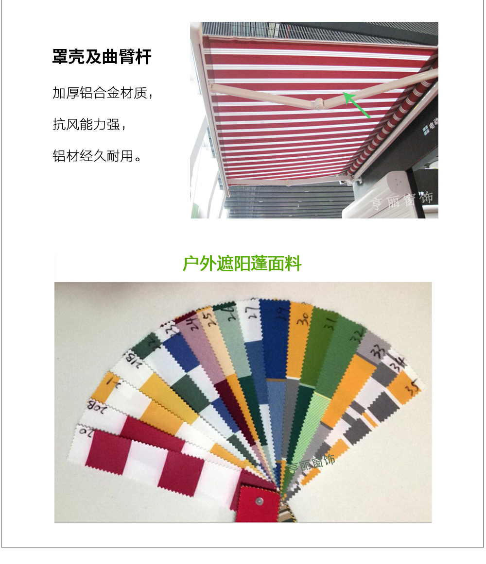 户外遮阳蓬可以把阳光与热量挡在窗外,遮最效果优越。风格清新,色彩靓丽的亨丽户外遮阳产品,不仅成为房屋装饰的点缀,更给火热的季节平添了几分凉意。该产品广泛应用于别墅、住宅、咖啡屋、商场、商铺等外遮阳。