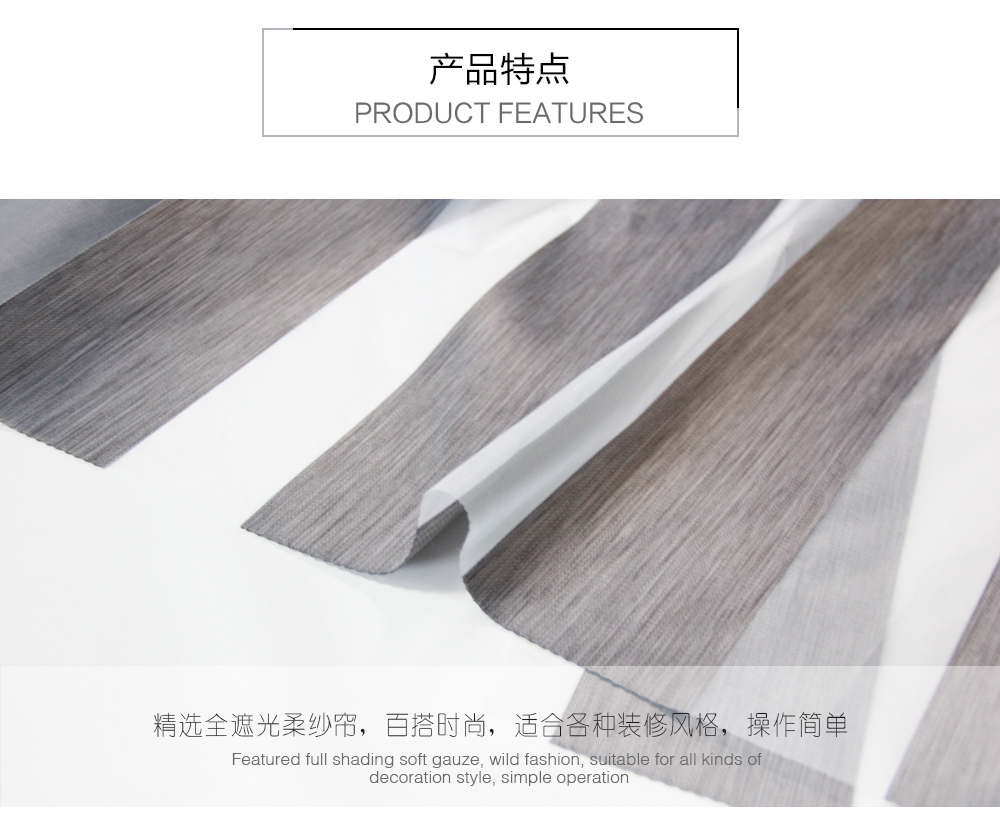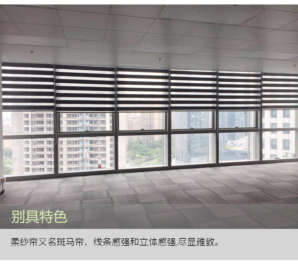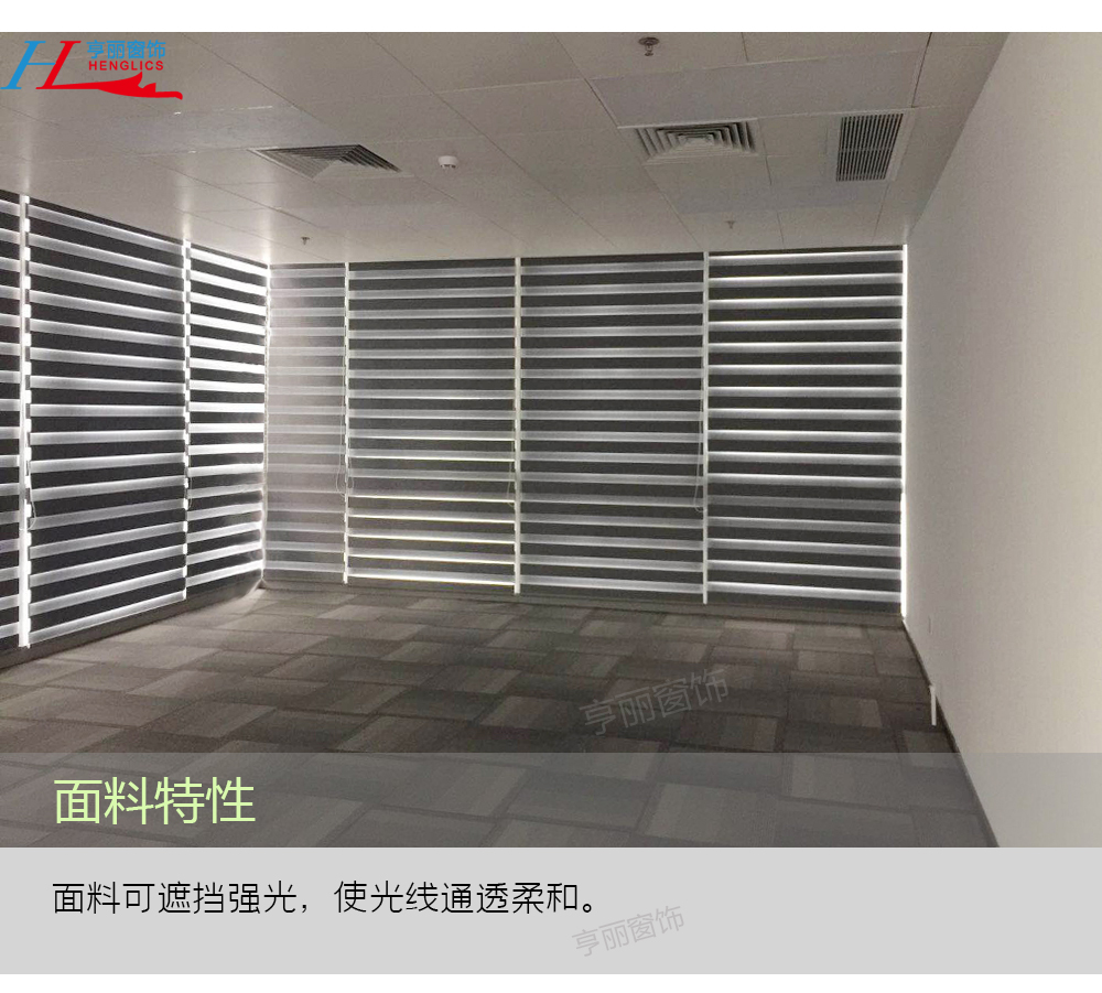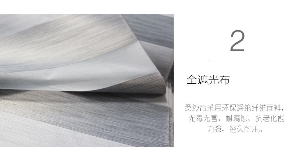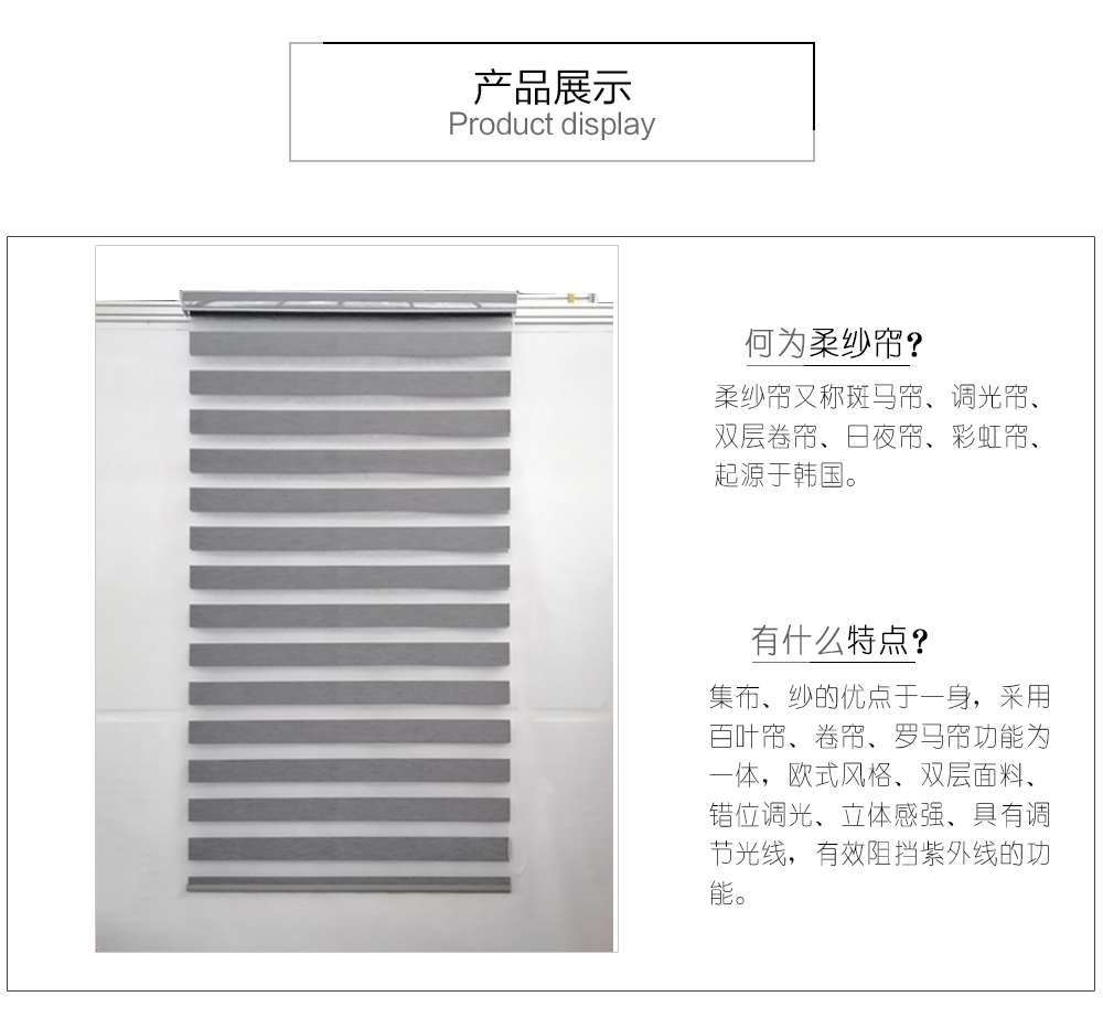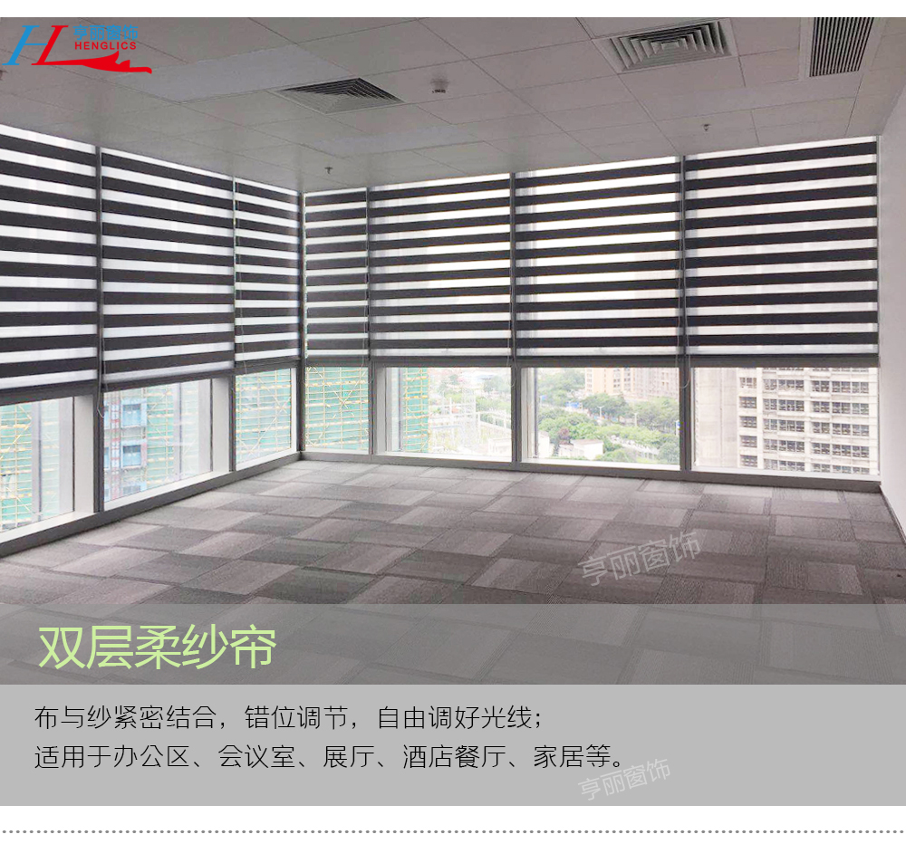 柔纱帘又名调光帘,双层卷帘,日夜帘,彩虹帘,柔丽丝等,源于韩国; 其材质以聚酯涤纶、麻、尼龙为主,采用双层面料可调节光线,不占空间。它集合了布和纱的优点于一身,集百叶帘、卷帘、罗马帘的功能于一体。亨丽窗帘可以做到:手动柔纱帘、电动柔纱帘、锂电池电动柔纱帘,手控斑马帘、电动斑马帘、电动锂电池斑马帘