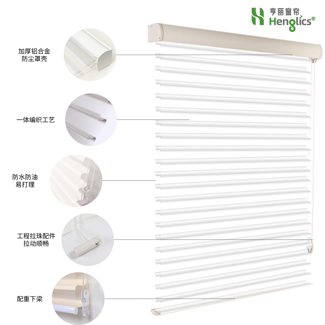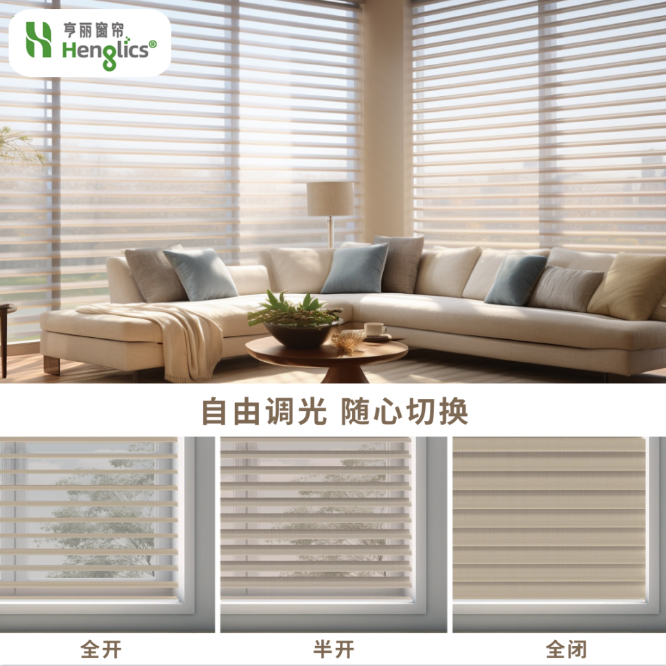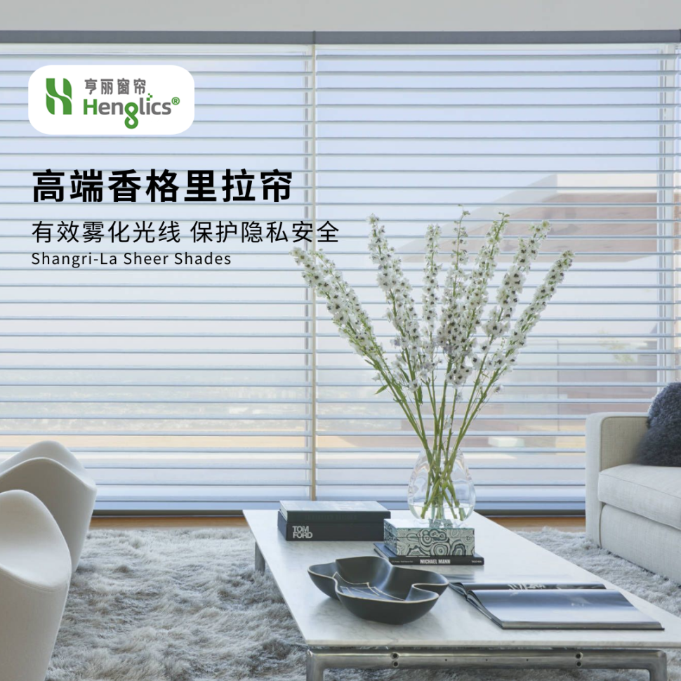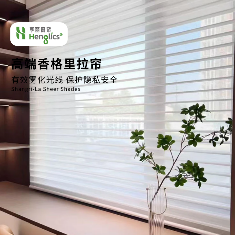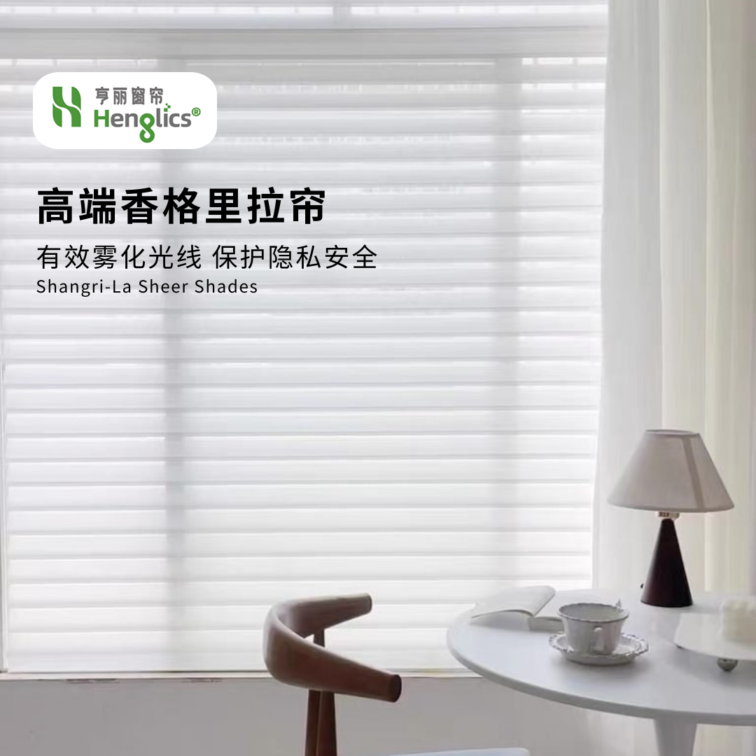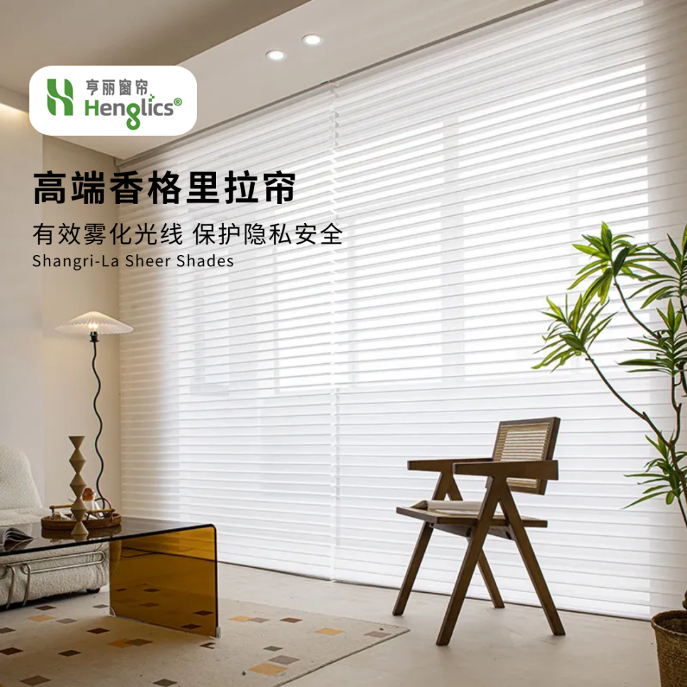 香格里拉帘是一种柔合了布帘、窗纱、百叶帘、卷帘于一身的崭新设计,具有拉帘纱幔的朦胧效果。取材于布、纱的香格里拉帘质地独特、外形美观,在两层轻柔的织物中连接水平面料可使室内保持柔和的光线。