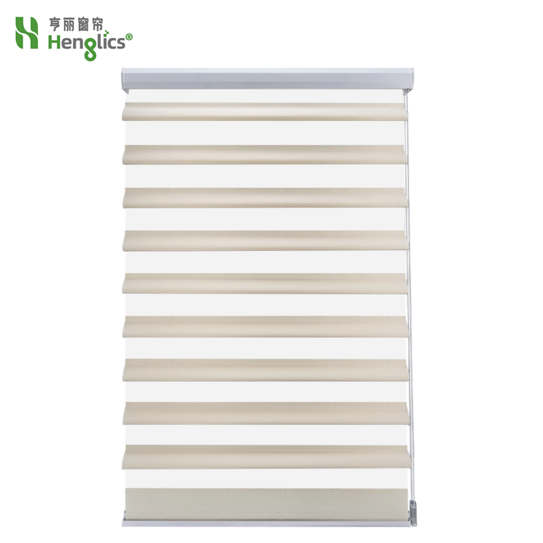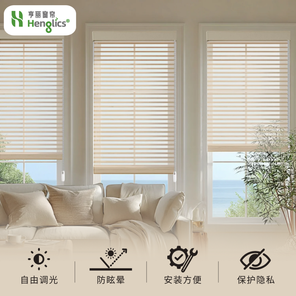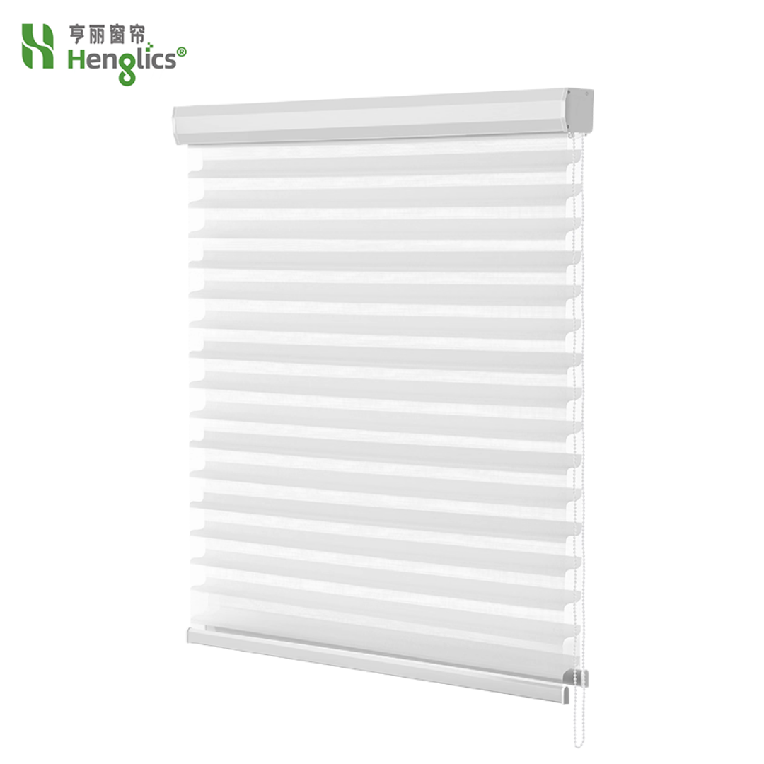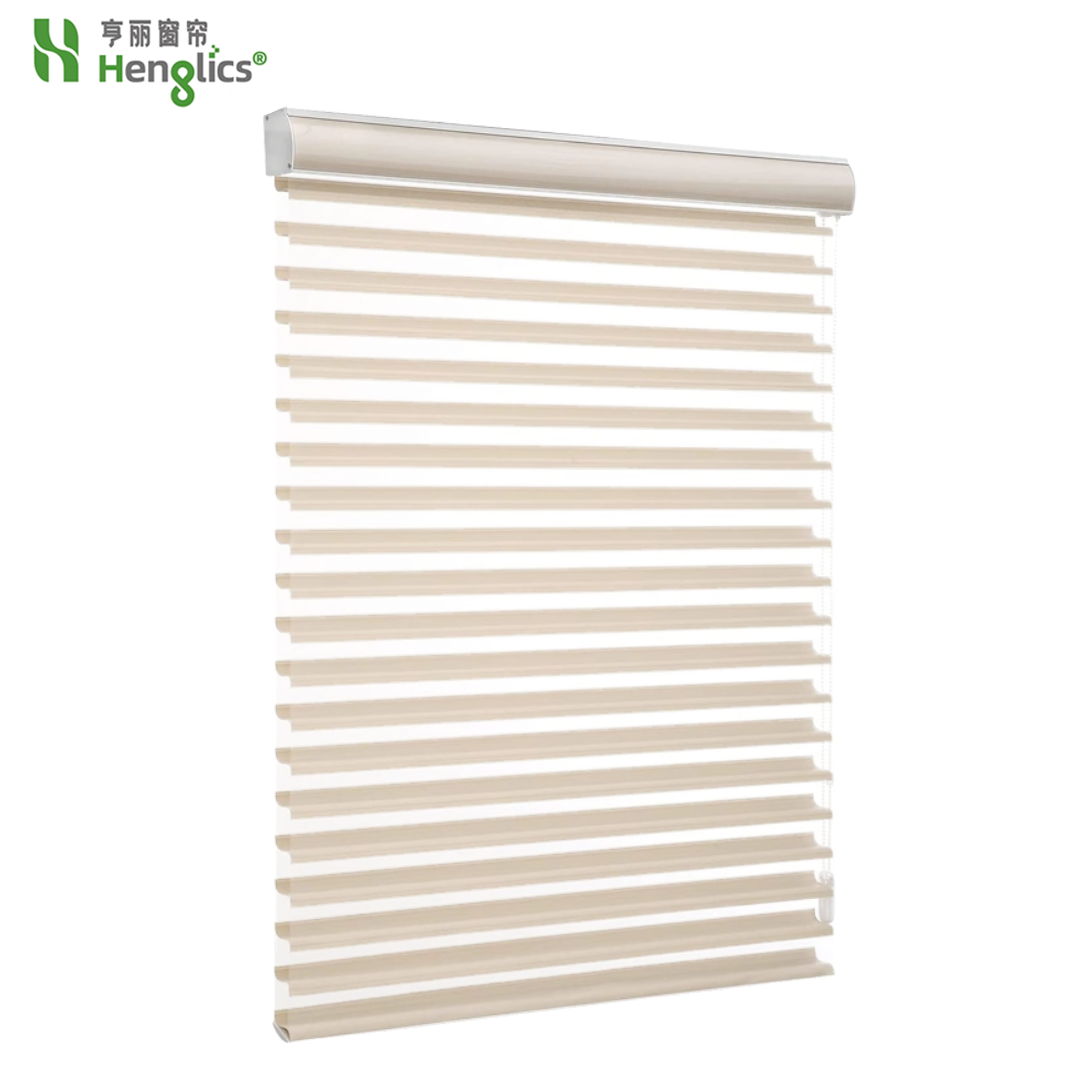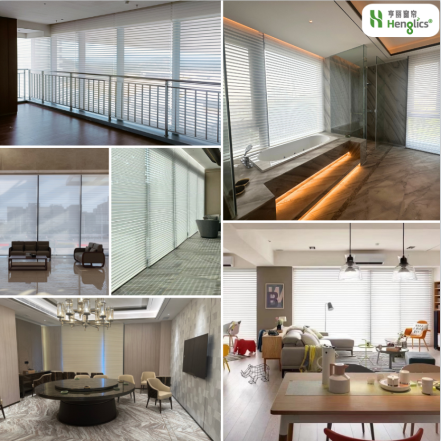 香格里拉帘是一种柔合了布帘、窗纱、百叶帘、卷帘于一身的崭新设计,具有拉帘纱幔的朦胧效果。取材于布、纱的香格里拉帘质地独特、外形美观,在两层轻柔的织物中连接水平面料可使室内保持柔和的光线。
