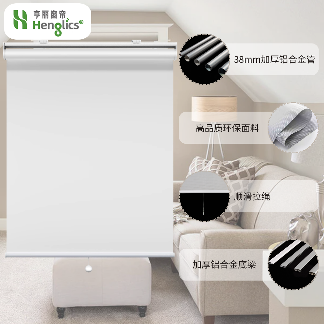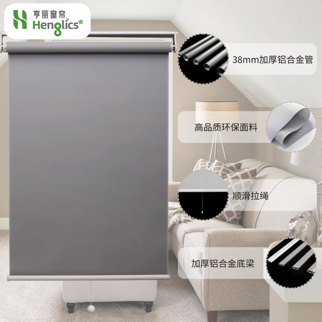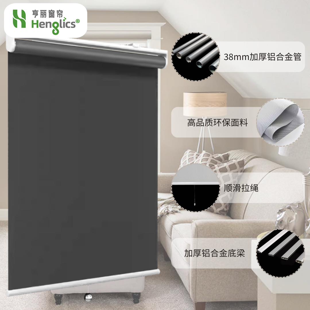 半自动弹簧卷帘,随拉随停,轻拉自动慢慢弹回,收起也方便;颜色多样,有半遮光和全遮光效果,适用于办公或者居家环境。