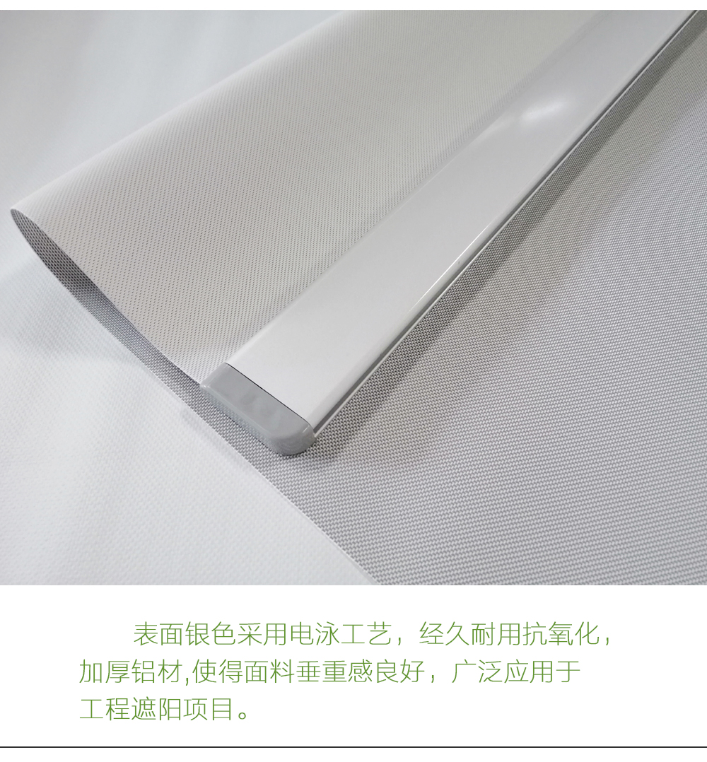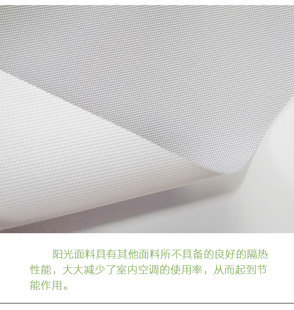 面料以全遮光、半遮光、阳光 面料为主,通过不同面料的选择可以达到全遮光、隔热、阻挡紫外线之效果,广泛应用在办公室,会议室,展览馆,大厅,咖啡厅,家庭、别墅等场所。