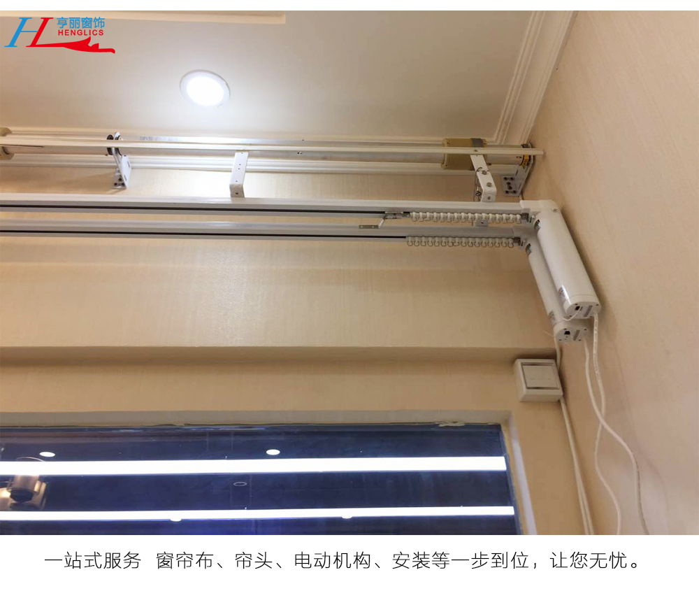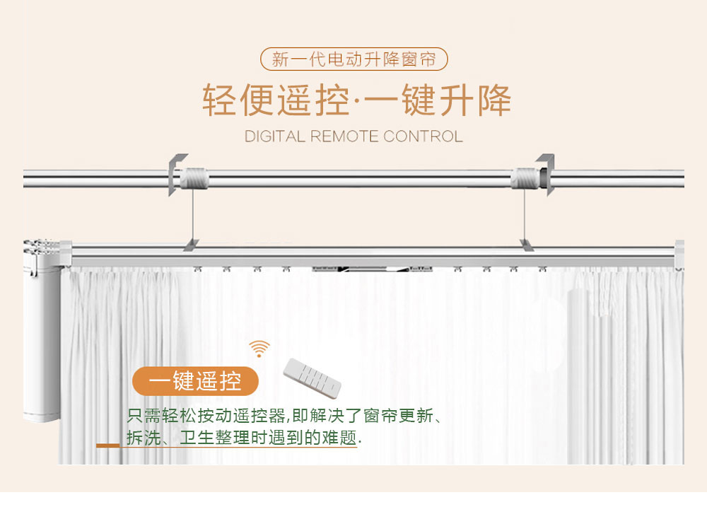 窗帘可实现弯轨或直轨,对高窗而言拆洗更安全方便,只需轻松按动遥控器 即解决了窗帘更新、拆洗、卫生整理时遇到的难题,